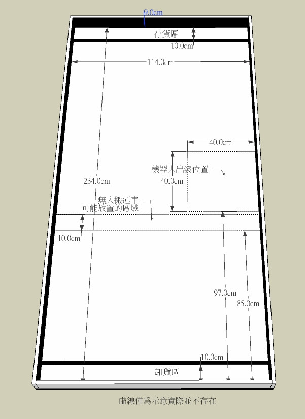 堆高機機器人由出發位置前進至卸貨區,將貨物由卸貨區搬運到存貨區,於搬運路途中設有兩台模擬無人搬運車之固定障礙物,作業時間為兩分鐘。